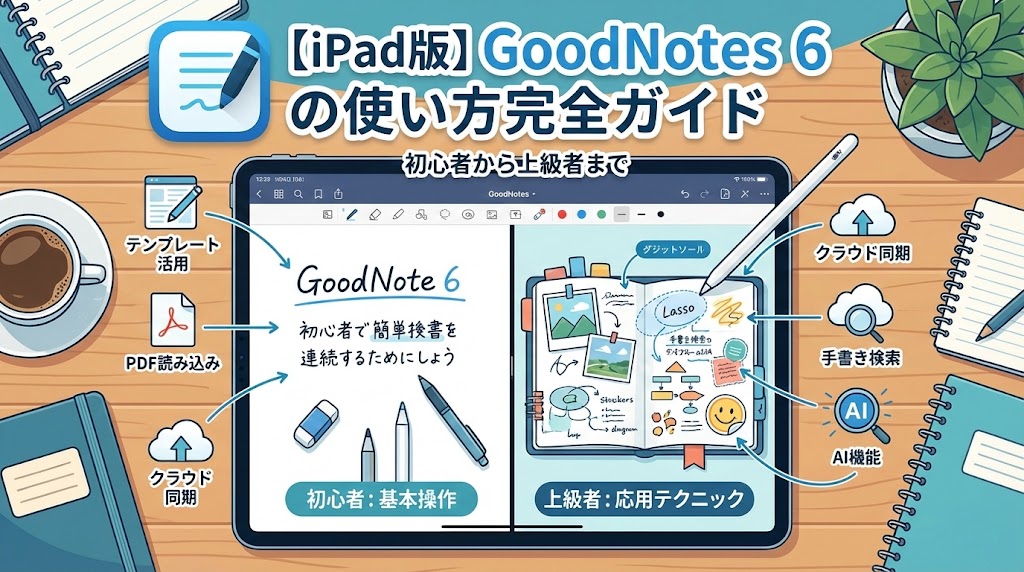 この記事では、iPad版 GoodNotes 6 の基本操作から、アッと驚く最新AI機能、そしてプロしか知らない時短テクニックまで、150%使い倒すためのノウハウを全て詰め込みました。