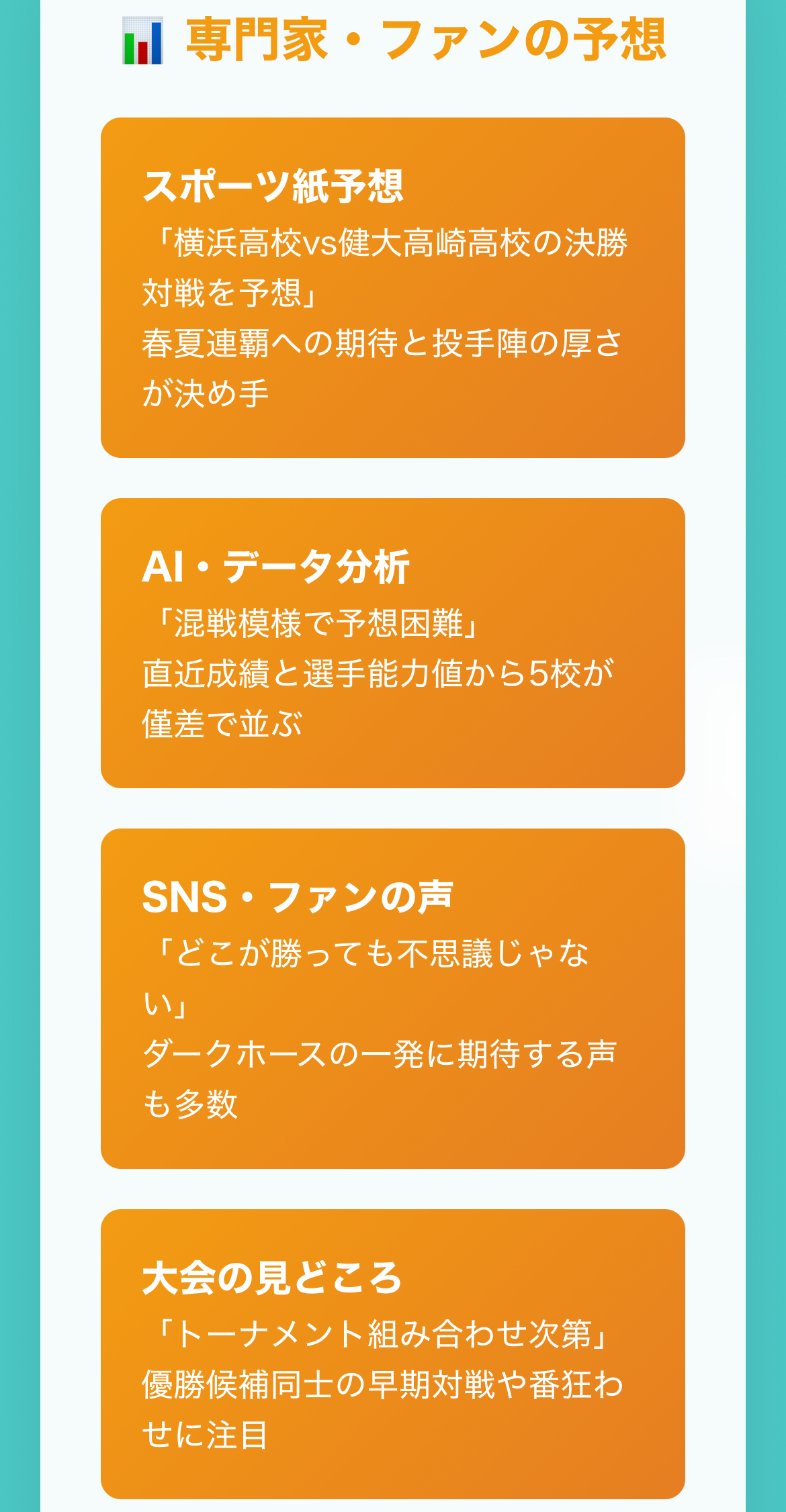 各校の過去の実績や今年の大会での勢い、さらにトーナメントの組み合わせや初出場のダークホース校まで幅広く紹介していますので、優勝候補や注目校について知りたい方にはぴったりの内容です。