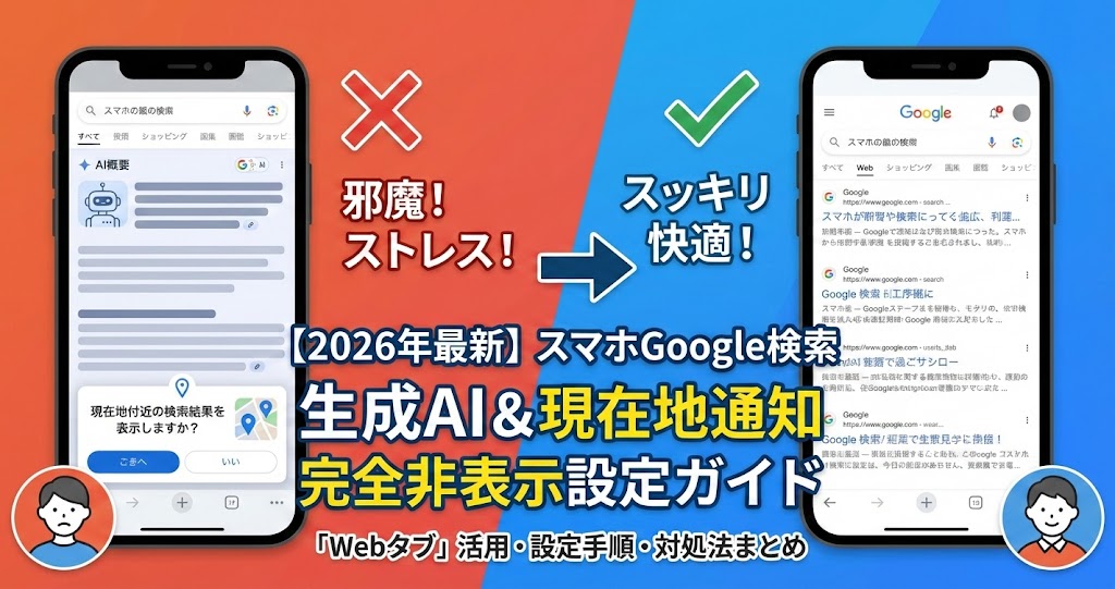 本記事では、スマホ版Google検索における「生成AI(AI概要)」と「現在地通知」の非表示設定について、徹底的に解説しました。