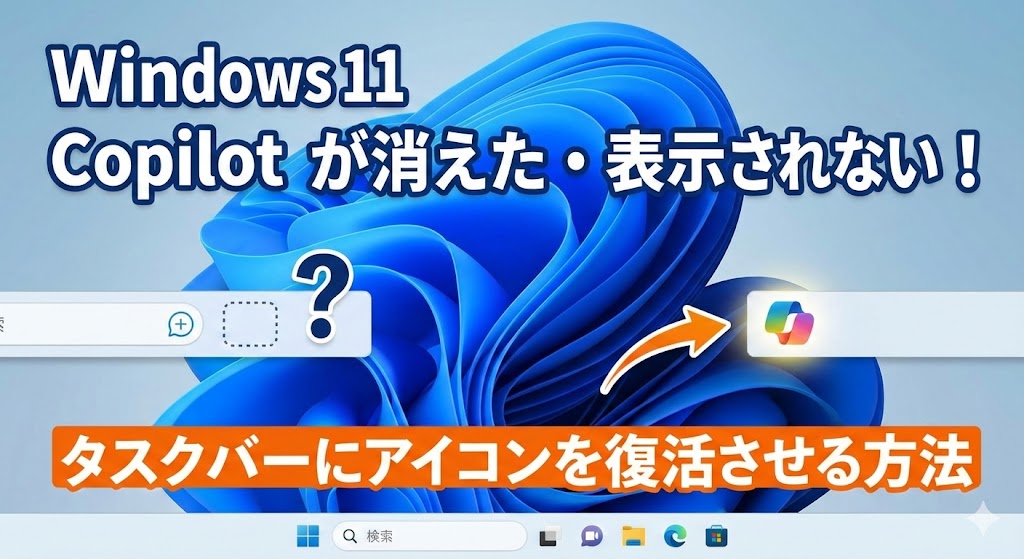 - ✅ 最優先の確認: 「設定」>「個人用設定」>「タスクバー」でCopilotのスイッチがオンになっているか確認!