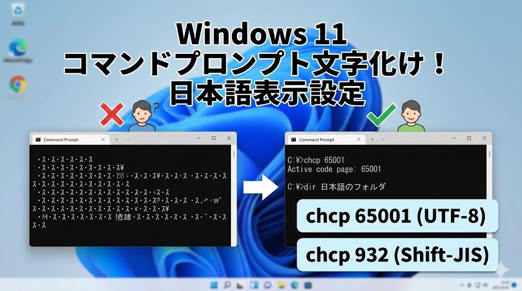 そんな不安で心臓がバクバクして、手汗を握りながら必死に「コマンドプロンプト 文字化け 直し方」「windows11 日本語 表示されない」なんて検索して、このページに救いを求めてたどり着いてくれたんじゃないでしょうか。
