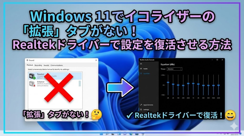 そんな不安と怒りで頭がいっぱいになって、必死に「windows11 イコライザー 拡張 ない」とか「Realtek ラウドネス等化 消えた」なんて検索して、このページに救いを求めて来てくれたんじゃないでしょうか。