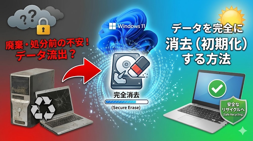 - 基本の消去: Windows設定の「このPCをリセット」で、「データのクリーニング」を「はい」にするだけで9割解決!