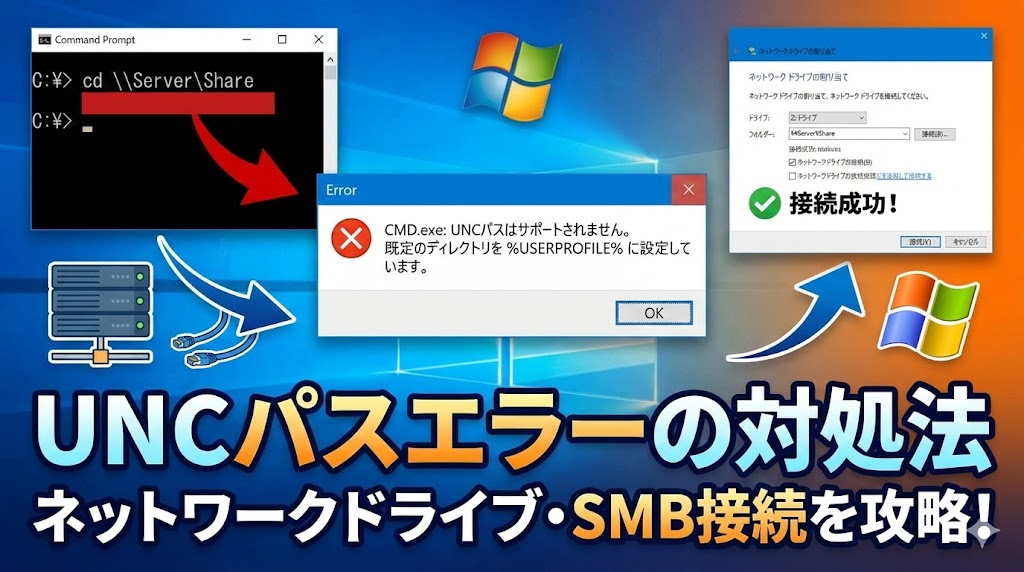 焦ってスマホを取り出し、「Windows11 UNCパス 接続できない cdコマンド」なんて検索して、藁にもすがる思いでこのページにたどり着いてくれたんじゃないでしょうか。