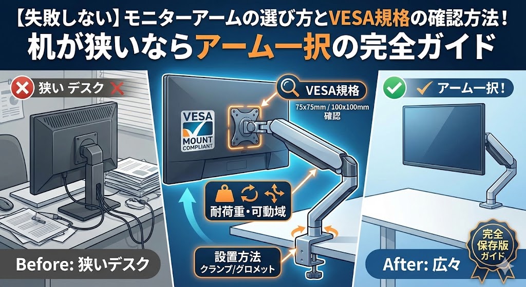- ✅ 失敗しない選び方:まずは「VESA規格」と「天板の強度」をチェックしてください(VESA確認方法へジャンプ)。