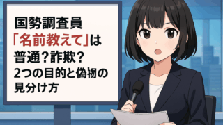お役立ち情報・豆知識 国勢調査員「名前教えて」は普通?詐欺?2つの目的と偽物の見分け方 「ピンポーン♪」国勢調査員を名乗る人が家に来て、開口一番こう言いました。「まずは名前を教えてください。」え…?名前から…?前回の調査では、ただポストに封書が入っていただけだったのに…。「前回は封書だけもらっていたので今回も封書だけ下さい、あ... お役立ち情報・豆知識
