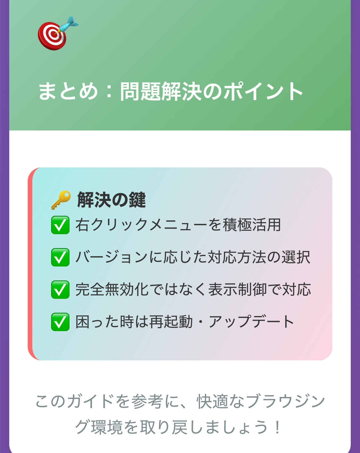 もしedgeのタブ グループが邪魔だと感じている場合は、この記事を参考に問題解決へ一歩踏み出してみてください。読者の方それぞれの環境に合わせた方法を提案していますので、きっとご自身に合った解決策が見つかるはずです。