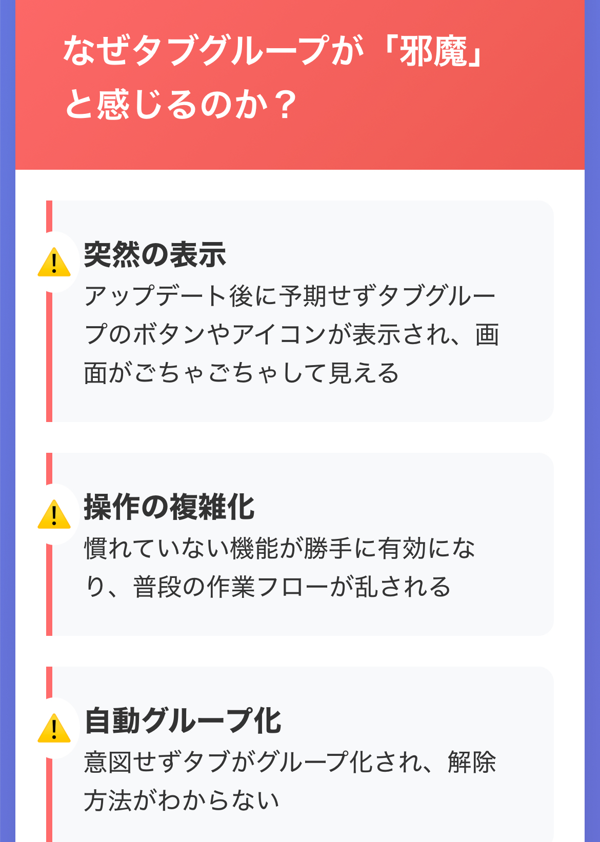 Edgeのタブグループ機能が「邪魔」と感じられることには、いくつかの明確な理由があります。結論として、多くのユーザーが、タブグループの自動表示や消し方がわかりにくいこと、思いがけず操作が増えてしまうことにストレスを感じています。