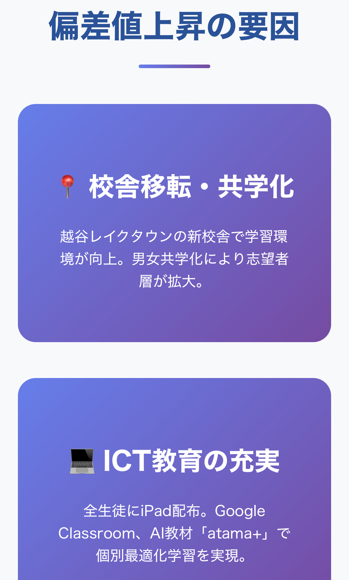 さらにICT教育やAI教材の導入によって、個々の学力や弱点に合わせた指導が受けられることも、偏差値上昇の大きな理由になっています。