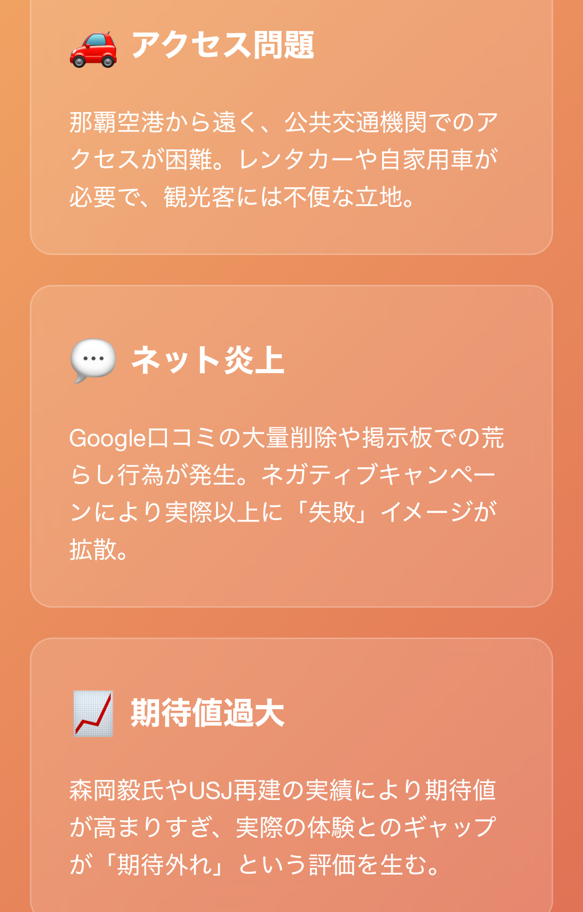 このように、元USJ社長の実績や戦略がジャングリア沖縄でそのまま通用しなかった理由は、地域性、立地、天候、施設コンセプトなど、さまざまな面でUSJとは全く異なるチャレンジが必要だったからです。今後は現地の特性や利用者の声を踏まえた独自の改善や新しい取り組みが、評価を変える鍵となっていきます。