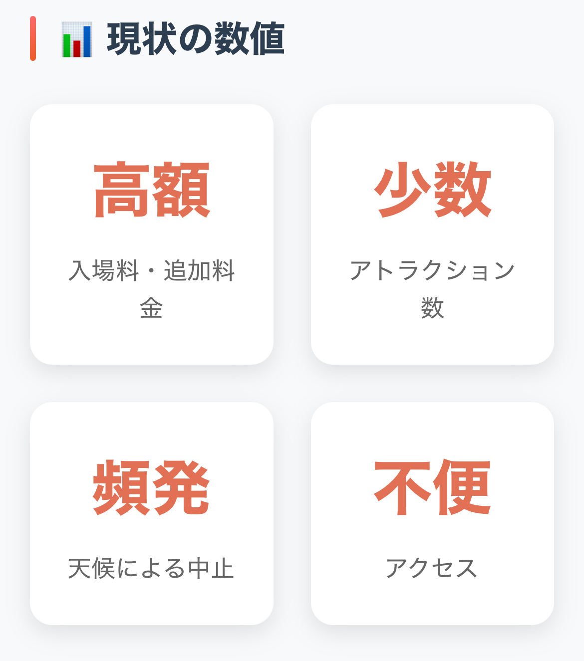 - 屋外アトラクション中心で天候リスクに弱い構造となっていた