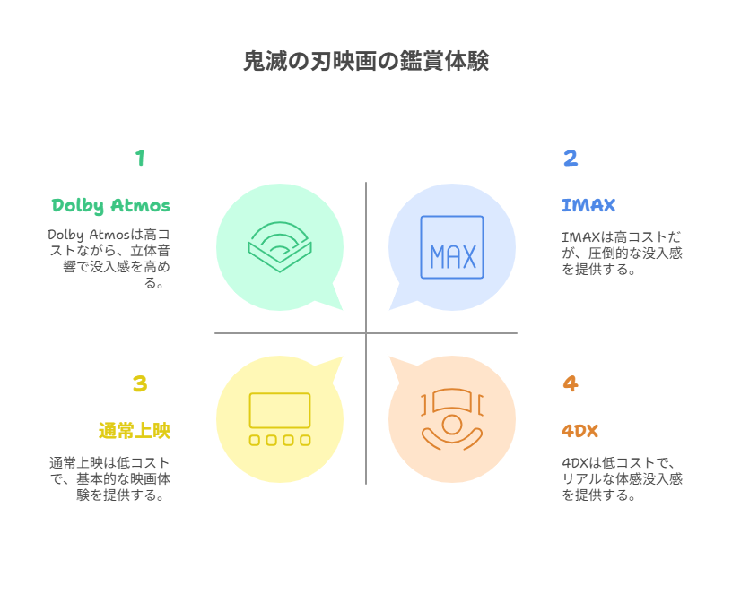 このように、鬼滅の刃映画をIMAXとDolby Atmosのどちらで観るかを選ぶ際には、追加料金やコスパだけでなく、自分がどんな体験を重視したいのか、どこで鑑賞するのかを踏まえて検討することが大切です。