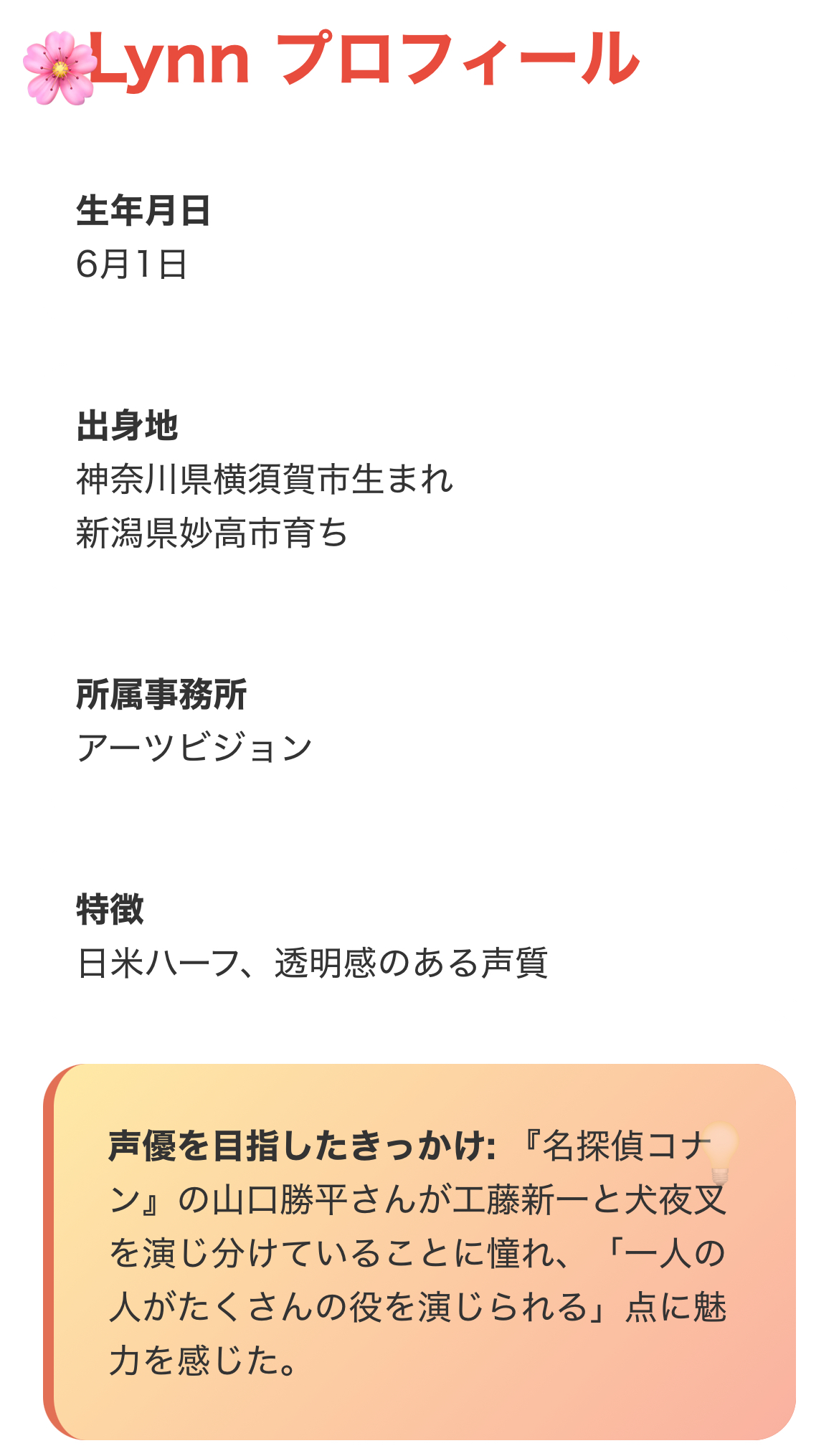 - Lynnさんは繊細な声質と感情表現の幅が特徴の声優です。