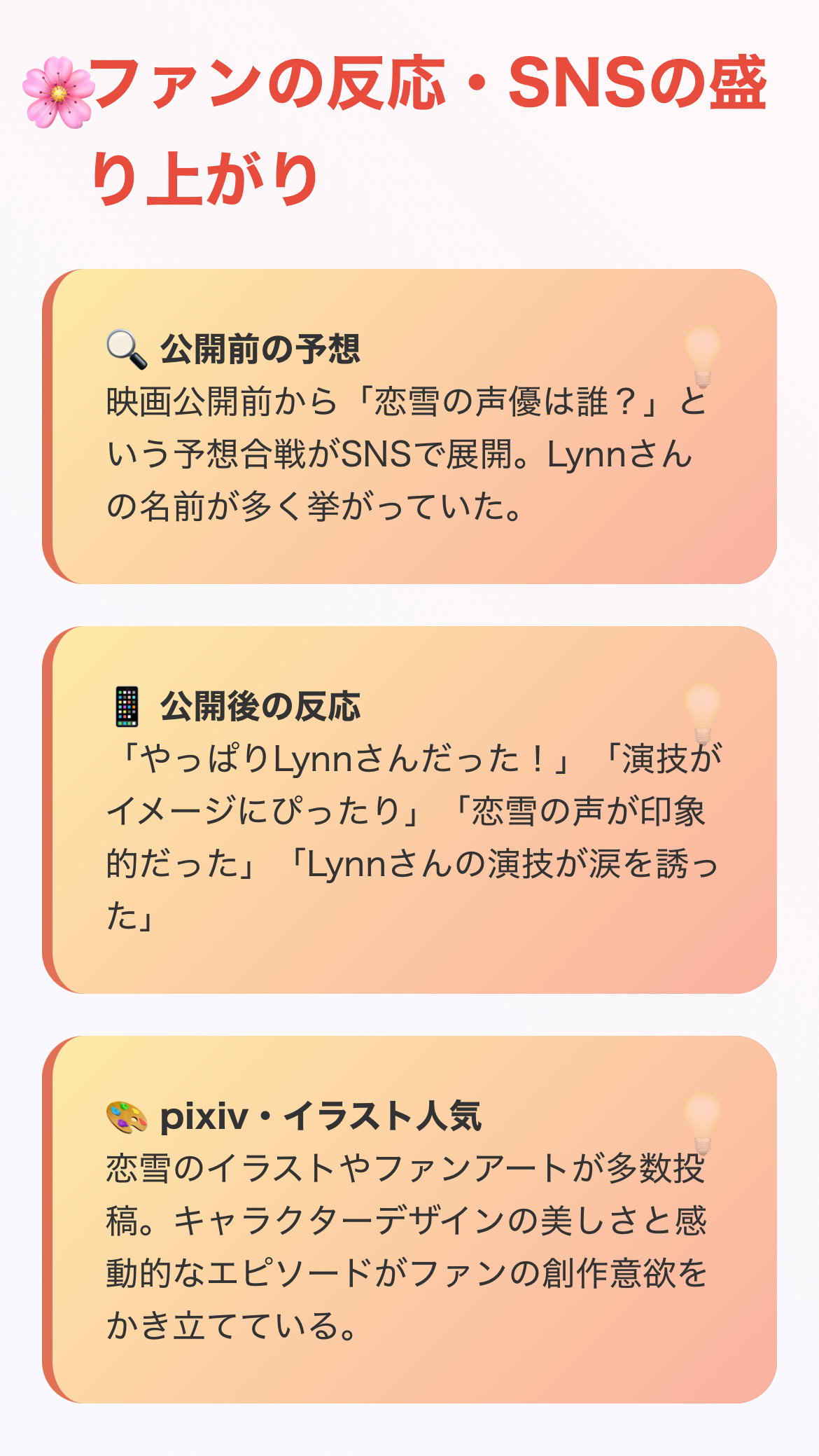 映画公開後には「恋雪の声が印象的だった」「Lynnさんの演技が涙を誘った」といった感想がSNSでも多く投稿されています。