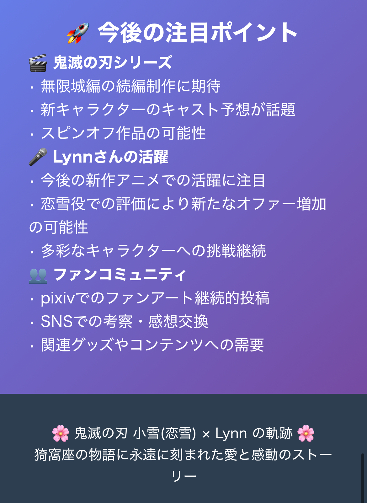 鬼滅の刃での小雪役も、Lynnさんのキャリアの中で大きな転機となっただけでなく、アニメファンや原作ファンの心にも深く残る演技となりました。