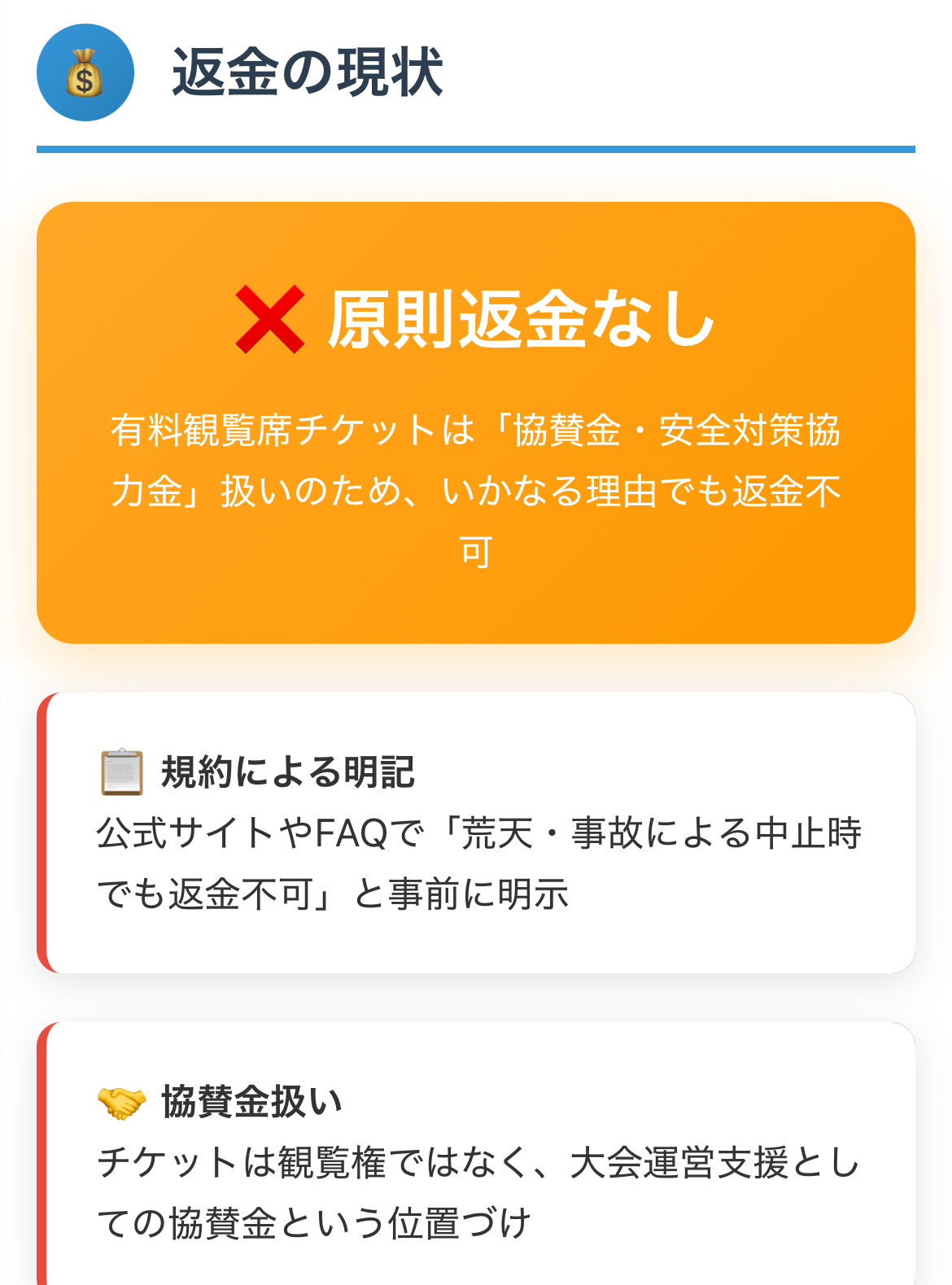 • 有料観覧席でも返金無しは協賛金や安全対策協力金としての性質が強い