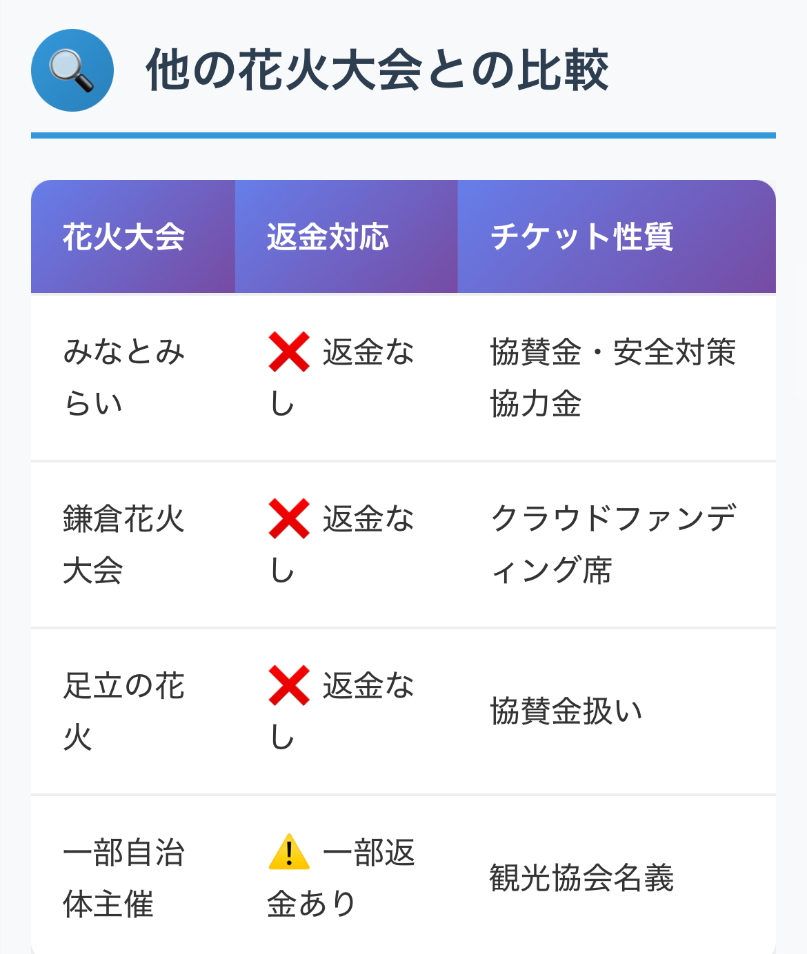 • みなとみらい 花火大会の返金対応は他の花火大会と比べてどう?