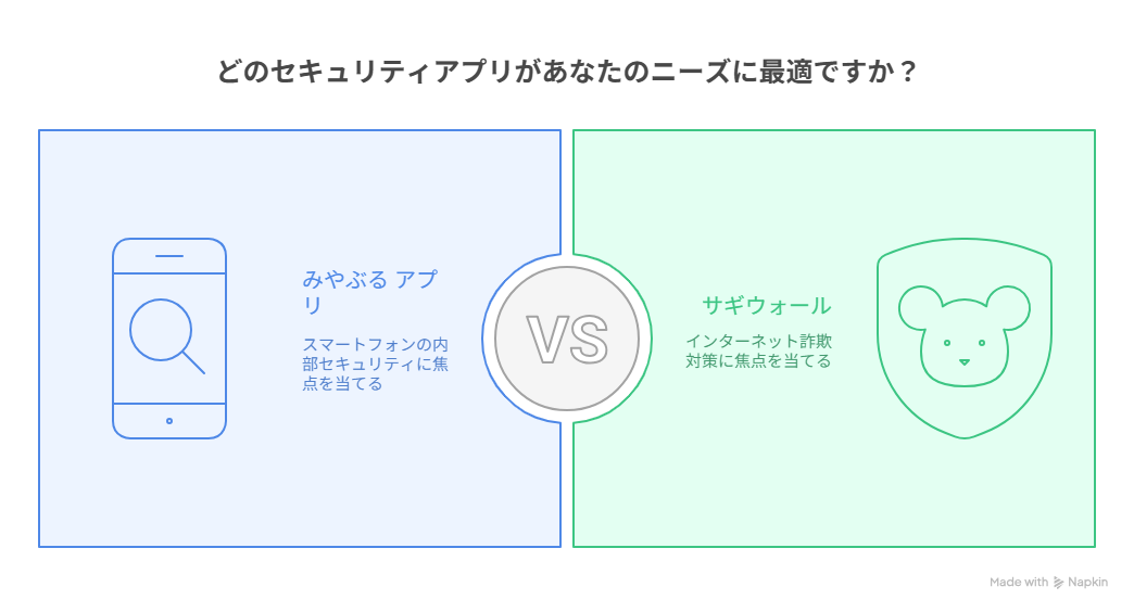 みやぶる アプリとサギウォールは、どちらもスマートフォンの安全を守るためのセキュリティアプリですが、役割や特徴に明確な違いがあります。