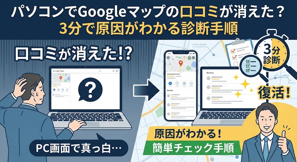 - ✅ 壊れてません:口コミが消えた原因は、PCの「キャッシュ(ゴミ)」が溜まっているだけの可能性大!(診断手順へ)