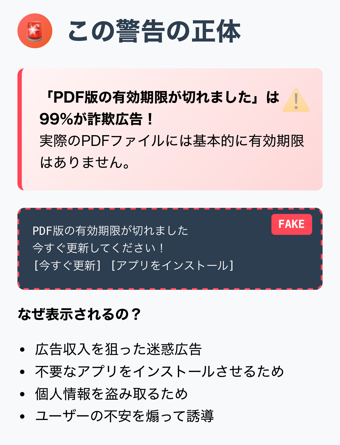 pdf版の有効期限が切れました警告は詐欺なのでしょうか。結論として、多くの場合これは詐欺的な迷惑広告であり、ユーザーをだまして不必要なアプリのインストールや、個人情報の提供を促す目的で作られています。なぜこのような警告が出るのかというと、ネットやスマートフォンアプリの広告枠を使って、巧妙に不安を煽るメッセージを流し、タップを誘っているからです。