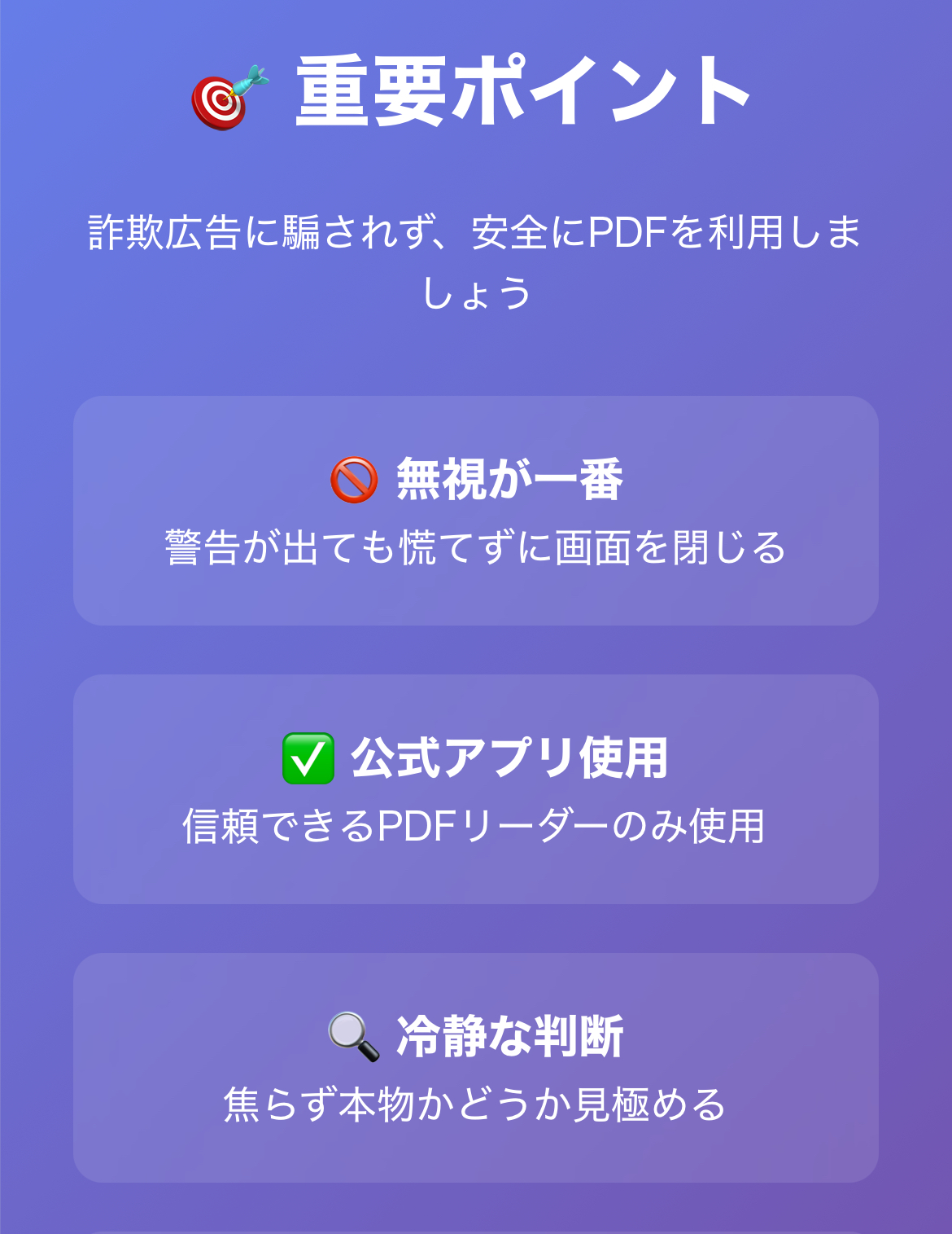 このように、PDFの有効期限切れ警告の多くは広告や詐欺的なものですが、もし本当にPDFが開けない場合は公式アプリで再度試してみてください。慌てて警告の指示通りに動くのではなく、冷静に対処することで端末や個人情報の安全を守ることができます。