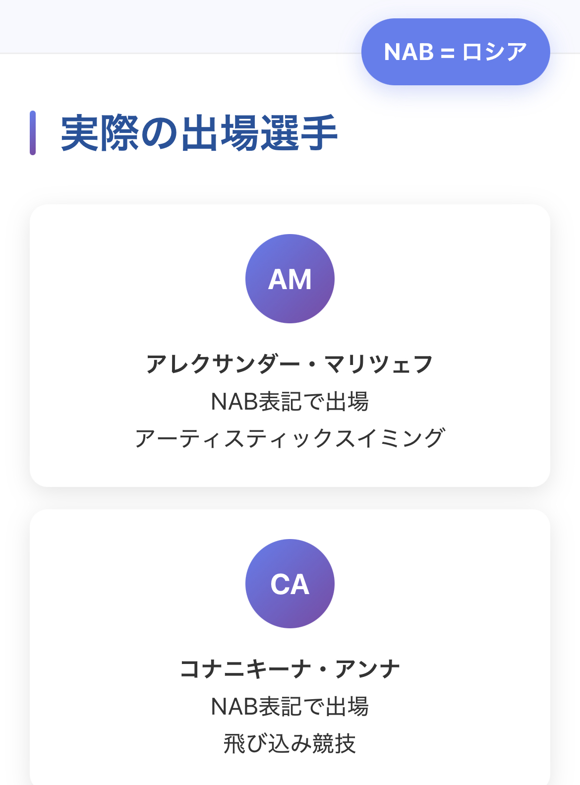 このような反応が生まれる理由は、nabという表記が国名や国旗を伴わずに用いられているためです。実際の大会会場や公式サイト、テレビ中継でも「nab」とだけ表示され、ロシアという国名は出てきません。このことが、多くの視聴者やファンにとって分かりづらさを生み、「nabの正体は何か」「nabはどこの国の略称なのか」といった疑問につながっています。