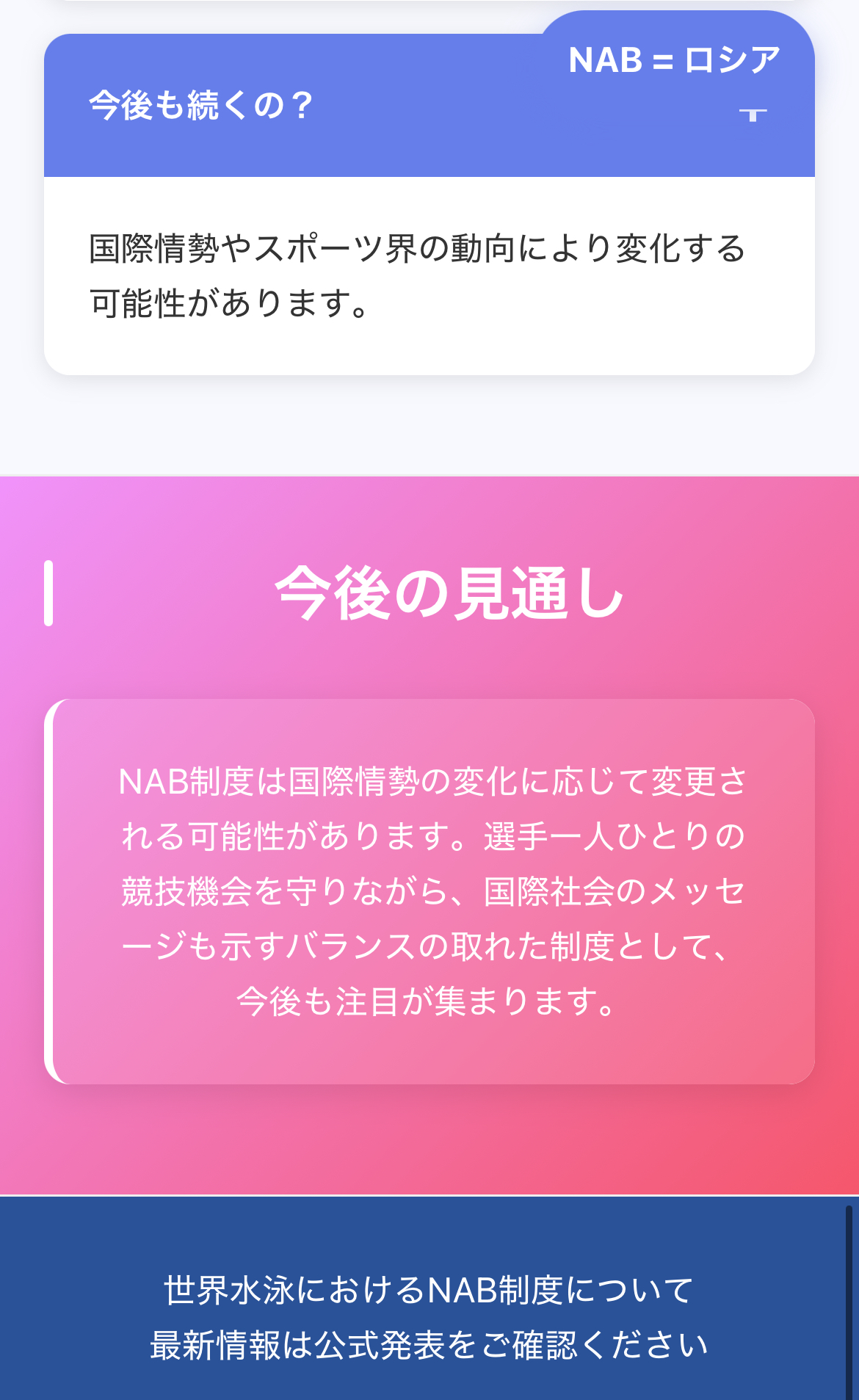 また、「nabはいつから使われているのか」「どの大会が初めてなのか」といった声もありますが、2025年の世界水泳からこの記号が使われ始めました。今後も国際情勢やスポーツ界の動向次第で、こうした中立選手の制度や表記は変わっていく可能性があります。