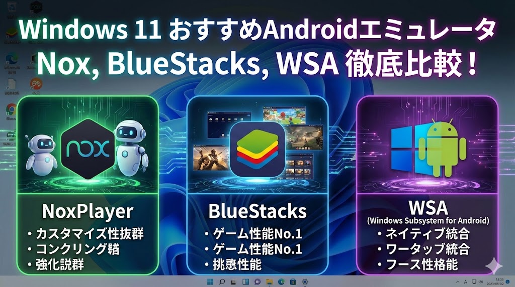 Windows 11のおすすめAndroidエミュレータは?Nox, BlueStacksとWSAを比較