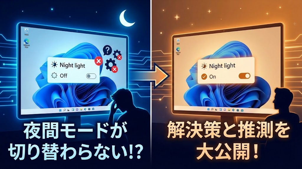 夜遅くまでパソコンに向かっているあなたにとって、夜間モードは目の疲れを軽減し、睡眠の質を守るための生命線とも言える機能ですよね。