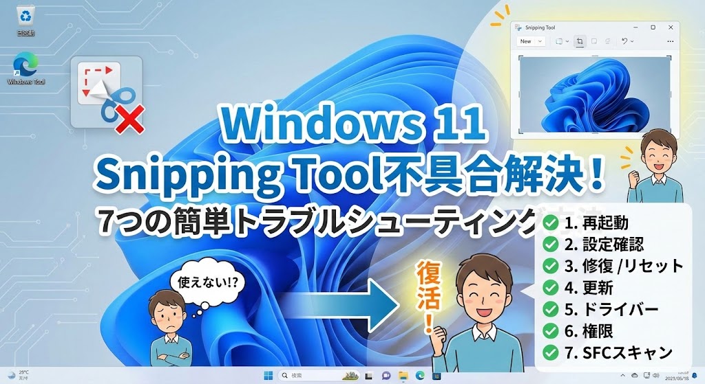 これらの方法は、Snipping Tool以外のWindows 11のトラブル(電卓が動かない、フォトが開かない等)にも応用できる基礎知識です。
